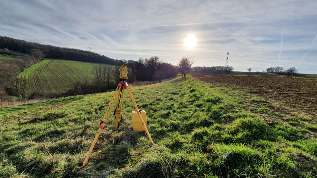Station totale installée sur un terrain vallonné lors d’un relevé topographique en milieu rural.